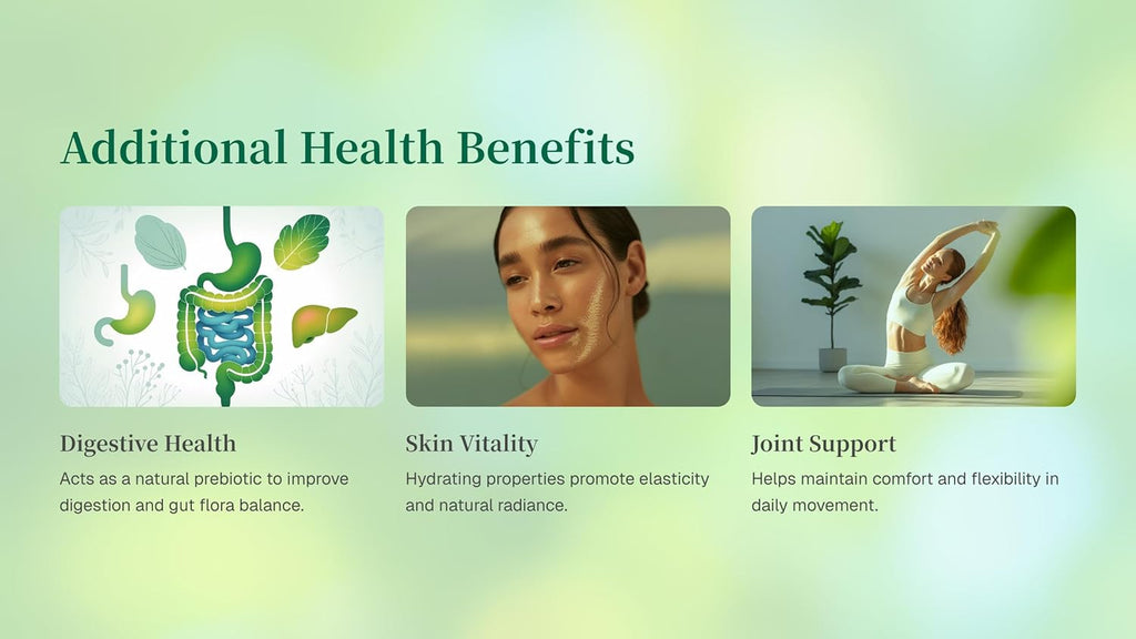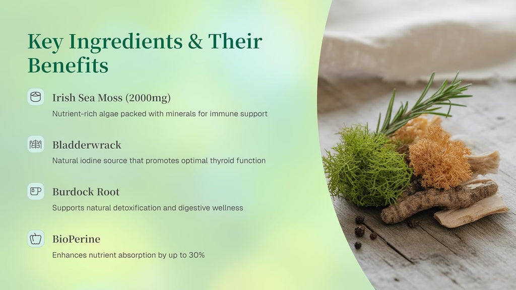 - Thyroid, Gut & Immune System Support Rich in natural iodine and antioxidants to promote balanced thyroid function, digestive health, and immune resilience. Clean Label – 100% Vegan & Wildcrafted Carefully crafted with plant-based ingredients. Free from GMOs, gluten, dairy, and artificial additives. Sustainably sourced and cruelty-free. Anti-Aging & Detoxifying Properties Helps reduce mucus buildup, supports joint wellness, and provides essential minerals for glowing skin and cellular energy.