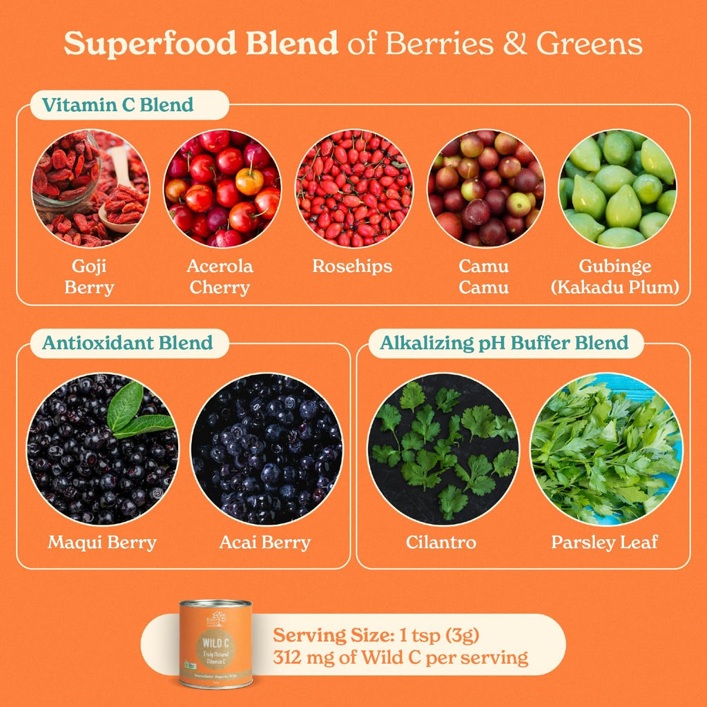 - ✅ Powdered Vitamin C Organic & Wild-Harvested Formula: Eden Healthfoods Wild C offers a premium blend of wild-harvested and organic berries, including acerola, maqui, and rosehips. This organic powdered vitamin C delivers 312mg of natural, bioavailable, non-toxic, and non-isolated vitamin C per teaspoon, ensuring maximum absorption and potency.