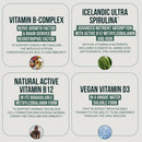 Vitamin D (as cholecalciferol), Thiamin (as thiamine mononitrate), Niacin (as niacinamide), Vitamin B6 (as pyridoxine HCl), Folate (as Folic Acid), Vitamin B12 (as methylcobalamin), Biotin, Pantothenic Acid (as calcium pantothenate), Icelandic Ultra Spirulina (Arthrospira platensis). Other Ingredients: Glycerine, Sorbitol.