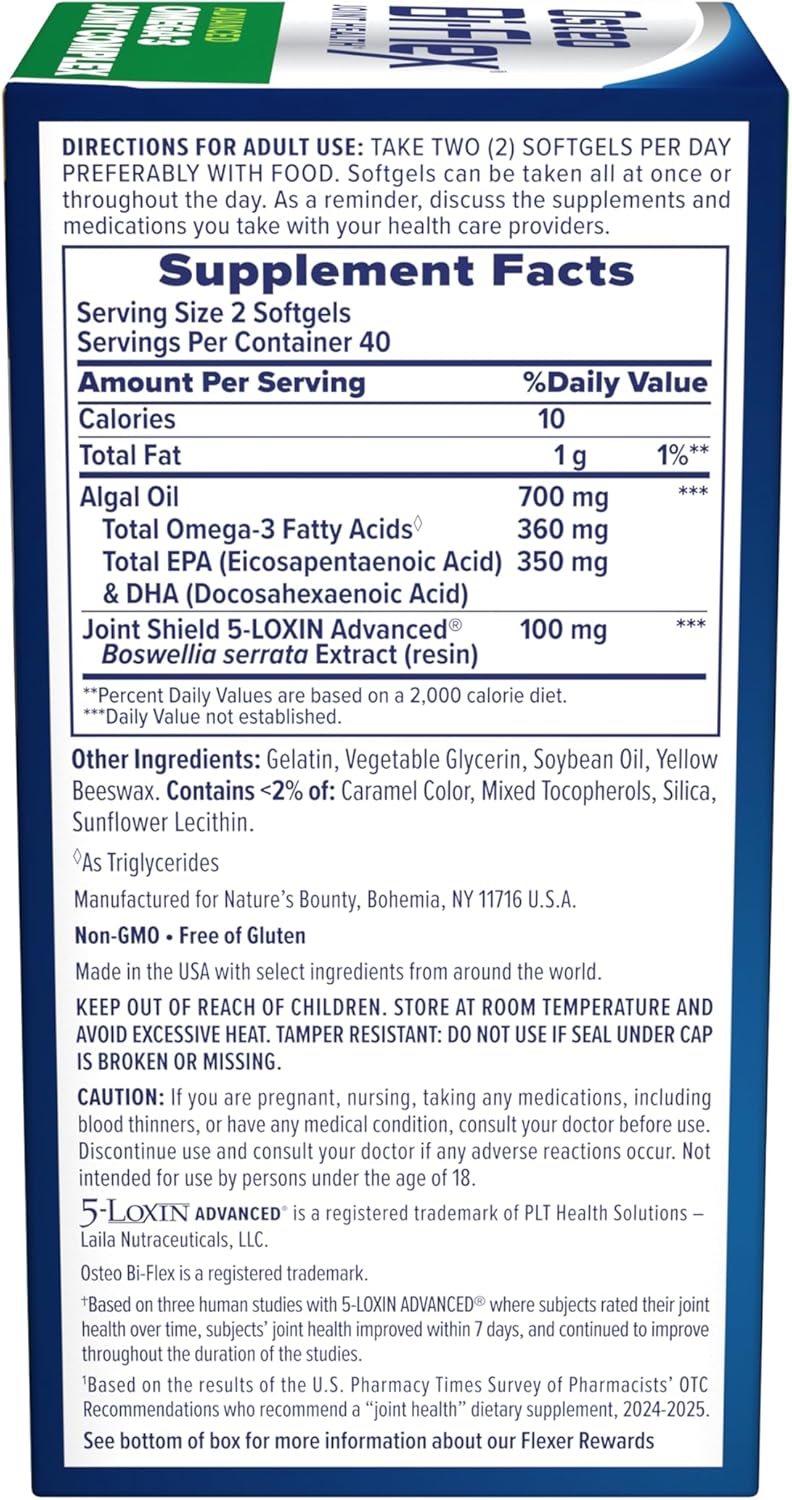 Osteo Bi-Flex Advanced Omega-3 Joint Complex is a new powerful formula from the #1 joint health brand (3). This breakthrough formula doesn’t just support your joint health—it’s designed to keep your whole body moving.(1) This joint support supplement combines two key joint health ingredients—Joint Shield 5-Loxin Advanced and Omega-3s from Algae Oil—to support joint comfort and whole body health (1). 5-Loxin Advanced, a concentrated herbal extract, is clinically shown to improve joint comfort in just 7 days (2) while 360mg of ultra-concentrated plant-based Omega-3s per serving deliver 5 whole body benefits: joint health, heart health, skin health, circulation, and cellular metabolism (1). Take daily to support your joint & whole body health & help keep you moving.(1) * or (1) These statements have not been evaluated by the Food and Drug Administration. These products are not intended to diagnose, treat, cure or prevent any disease. 2 or (2) Circana™ OmniMarket Core Outlets – Total MULO 52 wks ending 12.29.24 based on Nestlé Health Science’s custom definition for the Joint Health Supplement segment. 1 or ◊ or (3) Based on the results of the U.S Pharmacy Times Survey of Pharmacists’ OTC Recommendations who recommend a “joint health” dietary supplement, 2024-2025. † or (4) Based on three human studies with 5-LOXIN ADVANCED® where subjects rated their joint health over time, subjects’ joint health improved within 7 days, and continued to improve throughout the duration of the studies. ‡ or (7) In a select study, participants taking Joint Shield (5-LOXIN ADVANCED®) or placebo over 90 days rated their joint comfort during daily activities. Individual results may vary. 5-LOXIN ADVANCED® is a registered trademark of PLT Health Solutions – Laila Nutraceuticals, LLC. U.S." 3 or (9) Based on the results of the US News & World Report survey of pharmacists who recommend a “bone/joint supplement”, 2024."