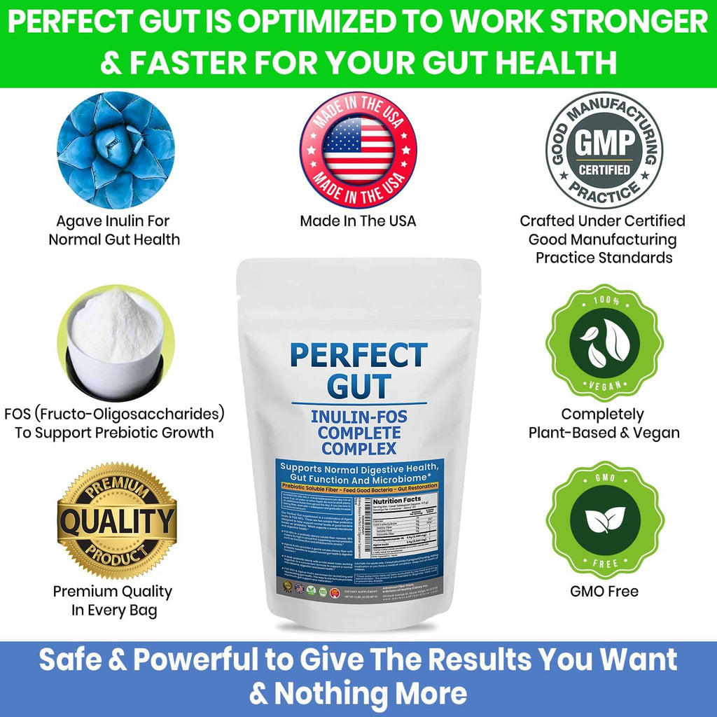 - Complete Digestive Support Formula unlike any other Inulin Fos out there. 2 distinct products combined into 1. Inulin and FOS supplement is specially formulated to aid and manage digestive discomfort. Its comprehensive approach to gut health promotes a balanced microbiome, aiding in smooth digestion and fostering long-term intestinal wellness. Regulate, restore & rejuvenate with Perfect Gut.