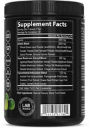 Greens Blend: Wheat Grass Juice Powder (Everraw), Microdried Kale Powder, Freeze-Dried Spinach Powder, Microdried Brussel Sprout Powder, Broccoli Sprout Powder, Super Mushroom Extract Blend: Agaricus Blazei Mushroom Extract, Reishi Mushroom Extract, Shiitake Mushroom Extract, Turkey Tail Mushroom Extract, Maitake Mushroom Extract, Chaga Mushroom Extract, Concentrated Antioxidant Blend: Acerola Fruit Juice Powder, Pomegranate Fruit Extract, Blueberry Fruit Extract, Grape Seed Extract, Acai Fruit Extract, Turmeric Root Extract. Other Ingredients: Natural Lime Flavors, Monk Fruit Extract.