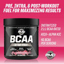 - Strengthen Your Workout Stack: Stack PMD’s BCAA with your favorite pre-workout supplement to help strengthen muscular performance and improve workout results. Support your pre-workout by using BCAA as an intra-workout to keep your workout going strong. Or use PMD’s BCAA alongside your favorite protein to help support an even greater degree of recovery. If you are serious about your training and always looking for that edge PMD's BCAA can help you achieve the results you deserve.