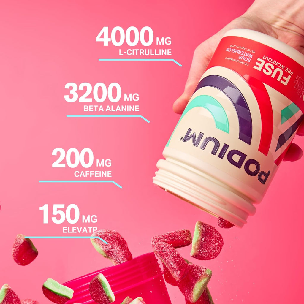- TASTY FLAVORS: Podium Nutrition, Fuse Pre Workout powders come in two amazing flavors:sour watermelon and peach mango. Drink up before heading to the gym or prior to training. Simply mix 1 scoop of preworkout power with 6-8 ounces of water, shake, and drink. Consumer 15-20 minutes prior to starting your workout or activity for best results.
