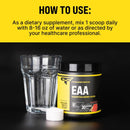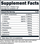 2:1:1 BCAA (L-Leucine, L-Isoleucine, L-Valine), L-Lysine HCl, L-Threonine, L-Phenylalanine, L-Histidine, L-Tryptophan, L-Methionine, Malic Acid, citric acid, natural and artificial flavors, sucralose, silica, beet root powder (for color), acesulfame potassium