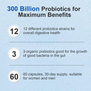 - Most Benefit Probiotics For Digestive Healt: 12 targeted probiotic strains including Lactobacillus and Bifidobacterium, different high-quality strains build a better intestinal environment. 300 billion CFU of probiotics and prebiotics help natural gut flora and digestive balance and work more efficiently. 60 capsules, 30-day supply, probiotics for women and men