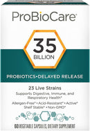 Supports digestive, immune, and respiratory healthContains 23 live probiotic strainsAcid-resistant DRcaps vegetable capsulesShelf-stable desiccant-lined bottleNon-GMO and free of gluten, dairy, egg, wheat, fish, shellfish, tree nuts, peanuts, and soy ProBioCare Probiotic delivers 35 billion CFUs of live, active cultures scientifically selected to diversify your microbiome. This probiotic features 23 live strains to support your digestive, immune, and respiratory health. Each delayed-release, allergen-free vegetable capsule is acid-resistant to ensure these probiotics are protected from the harsh, acidic environment of your stomach. Frequently Asked Questions What are CFUs? CFUs, or colony forming units, are units of measurementthat express the potency of a probiotic. What exactly is a microbiome?A microbiome is a community of microorganisms that live together in a particular habitat. For example, your gut microbiome is comprised of bacteria, viruses, and other organisms that contribute to nutrient absorption, digestion, and directly impact your overall health. What is a desiccant-lined bottle and why is it important?A desiccant is a material that absorbs moisture. ProBioCare products have a desiccant-lined bottle to protect the probiotics from exposure to heat, light, and moisture, which can result in degradation and potency reduction. This also eliminates the need for refrigeration.