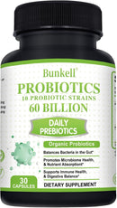 - Support Your Healthy Gut: Bunkell probiotic contains 10 diverse probiotic strains, and it is formulated with 3 types of organic prebiotics: Organic Jerusalem Artichoke Root, Organic Acacia Senegal, Organic Chicory Root. As a daily probiotics supplement, it works together for women & men to support your gut health and helps to support occasional constipation, diarrhea, gas & bloating!