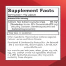 Serving Size: 1 Veg Capsule. Ingredients: Turmeric Root Extract (Curcuma longa) [Standardized to provide min .5% Curcuminoids (630 mg) (including Curcumin, Demethoxycurcumin and Bisdemethoxycurcumin)] 665 mg. Other Ingredients: Cellulose (capsule), Silica and Magnesium Stearate (vegetable source).