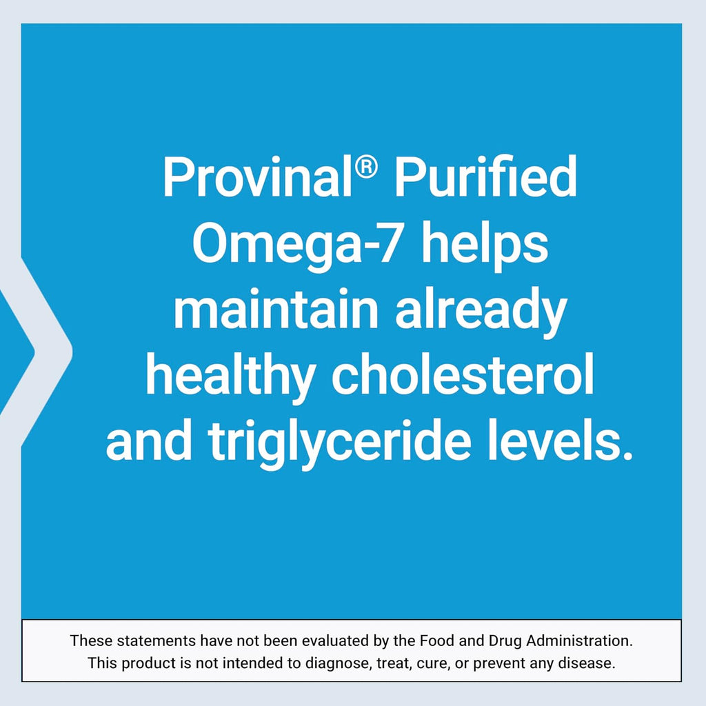 - STUDIES SHOW QUICK RESULTS - Provinal Purified Omega-7 contains 210 mg of omega-7 palmitoleic acid to help maintain already-healthy cholesterol and triglycerides levels. It also promotes a healthy inflammatory response and healthy glucose metabolism. In fact, studies show a daily dose of 210 mg can offer the support you're looking for in as little as a month.