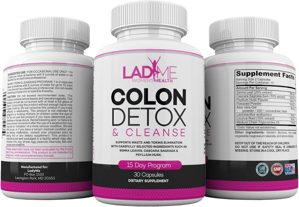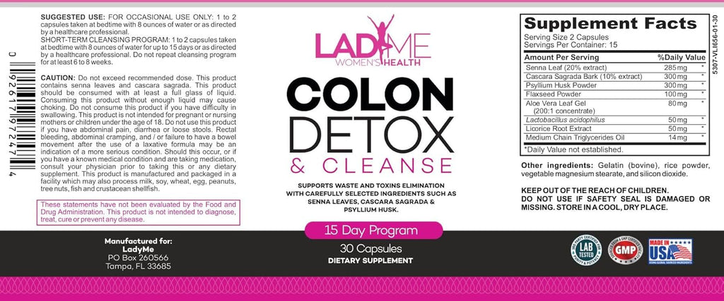 - PACKED WITH NATURAL INGREDIENTS: Every single capsule of Ladyme's colon cleanser is blended with pure natural ingredients such as psyllium husk, cascara sagrada, senna leaves, flaxseed powder and aloe vera that are proven to be very beneficial for women's digestive health.