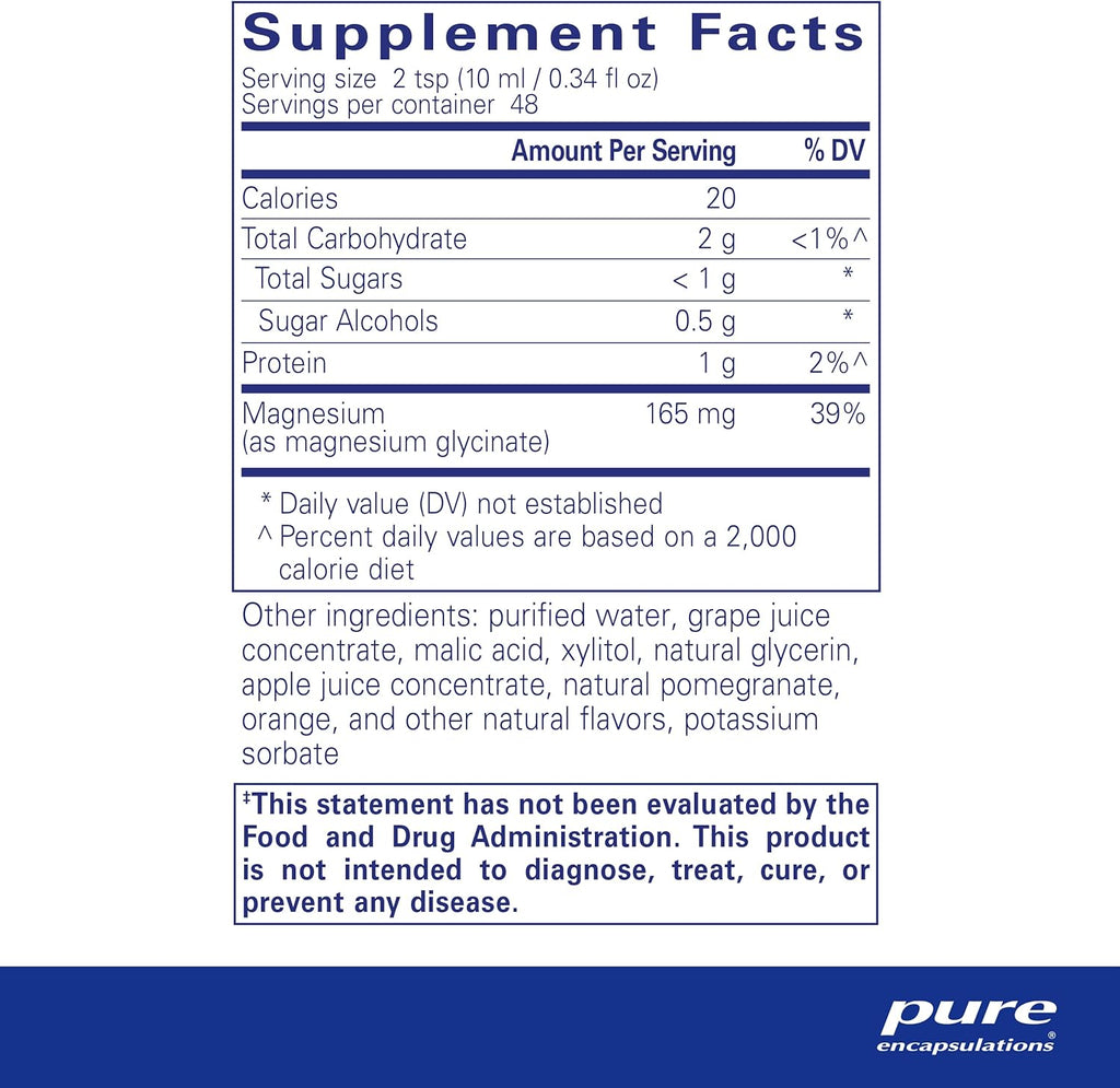 Each serving size (2 teaspoons) contains: Magnesium (as magnesium glycinate) 165 mg. Other ingredients: Purified water, grape juice concentrate, malic acid, xylitol, natural glycerin, apple juice concentrate, natural pomegranate, orange and other natural flavors, potassium sorbate.