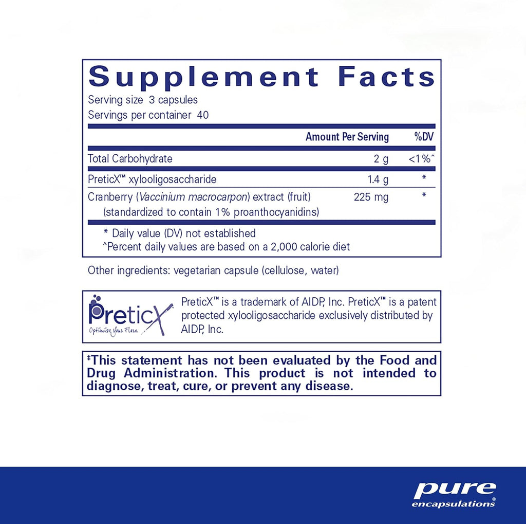Each serving size (3 capsules) contain: PreticX xylooligosaccharide 1.4 g, Cranberry (Vaccinium macrocarpon) extract (fruit) (standardized to contain 1% proanthocyanidins) 225 mg. Other ingredients: vegetarian capsule (cellulose, water).