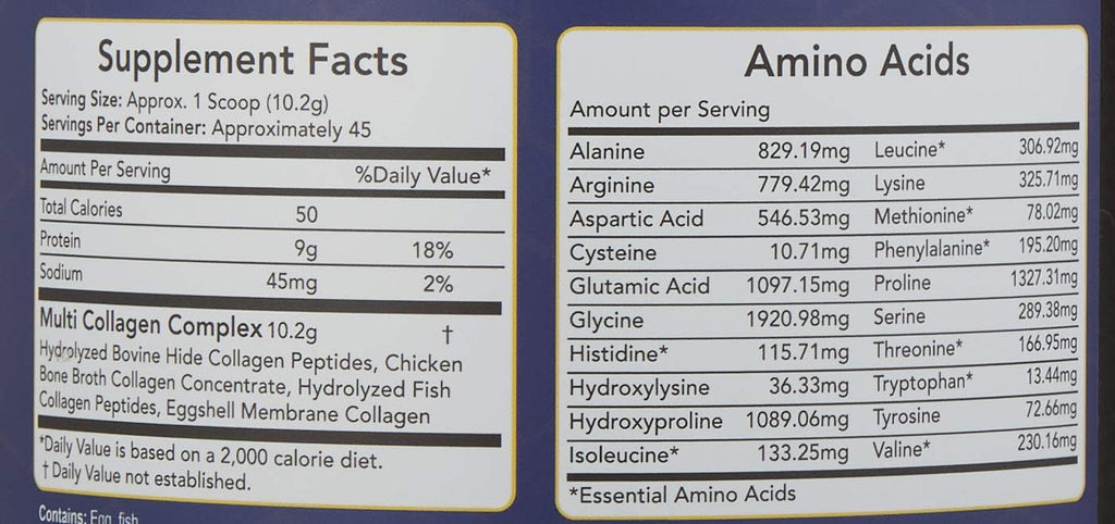 Multi Collagen Complex (10.2g) (Protein 9g) Hydrolyzed Bovine Hide Collagen Peptides, Chicken Bone Broth Collagen Concentrate, Hydrolyzed Fish Collagen Peptides, Eggshell Membrane Collagen