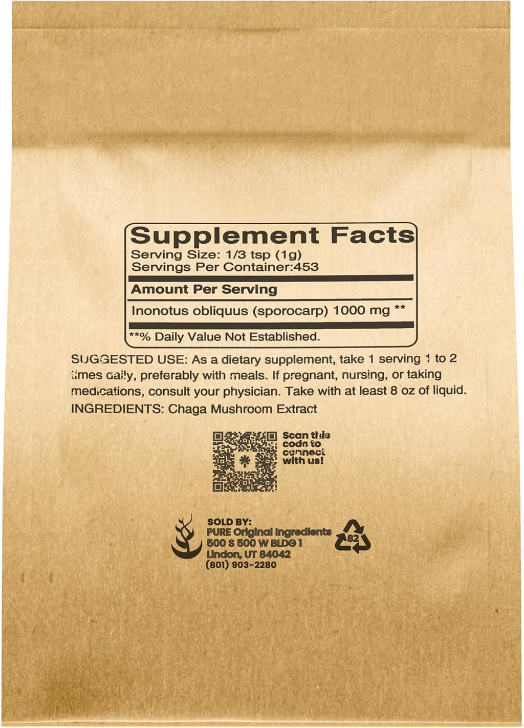 - Pure Original Ingredients Chaga Extract Powder is made from a single ingredient, providing a pure undiluted supplement