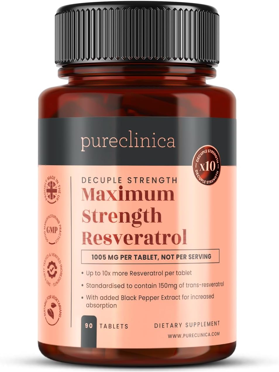 - HIGHEST STRENGTH. Weighing in at a whopping 1000mg of Reseveratrol per tablet, Pureclinica High Absorption Reseveratrol is the strongest possible dose we could make. Compared to any other Resveratrol supplement, it is between 10 and 2 times stronger.