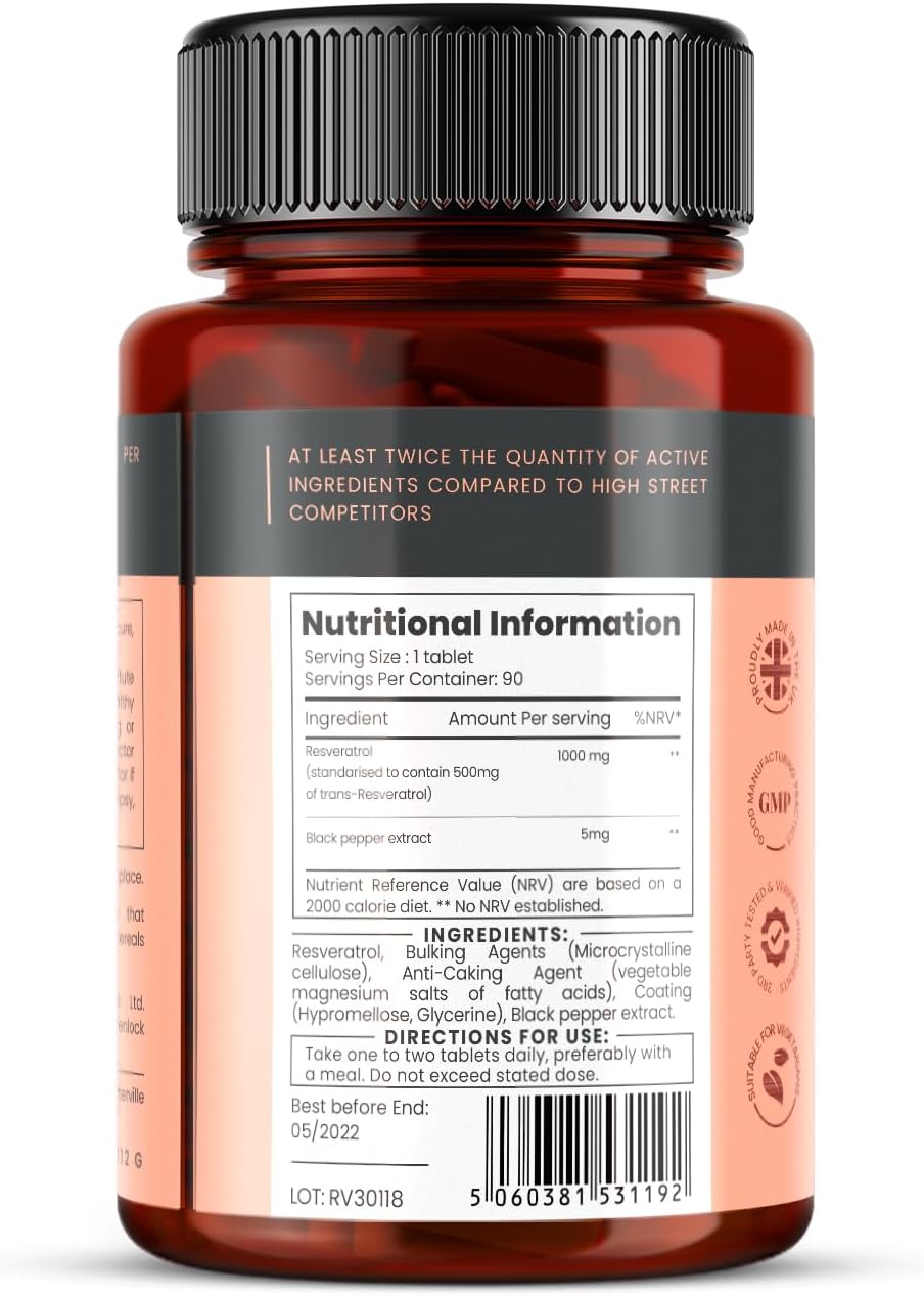 Serving Size: 1 tablet Servings Per Container: 90 Resveratrol (standardised to contain 500mg of trans-Resveratrol): 1000mg Black pepper extract: 5mg Other ingredients: Malt dextrin, vegetable magnesium stearate (as anti-caking agent).