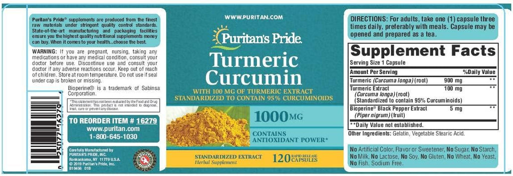 Puritan's Pride Turmeric Curcumin 1000 mg is a dietary supplement designed to deliver antioxidant properties and promote overall wellness.* Each rapid release capsule contains 1000 mg of Turmeric, with 100 mg of a Turmeric Extract standardized to 95% curcuminoids. Known for its natural health benefits, Turmeric is part of the ginger family and has been used for centuries in Asian cultures. The active ingredients, curcuminoids—most notably curcumin—provide antioxidant properties for the body.* Each bottle contains 120 capsules, so you can easily incorporate Turmeric Curcumin into your daily routine. *These statements have not been evaluated by the Food and Drug Administration. This product is not intended to diagnose, treat, cure or prevent any disease.