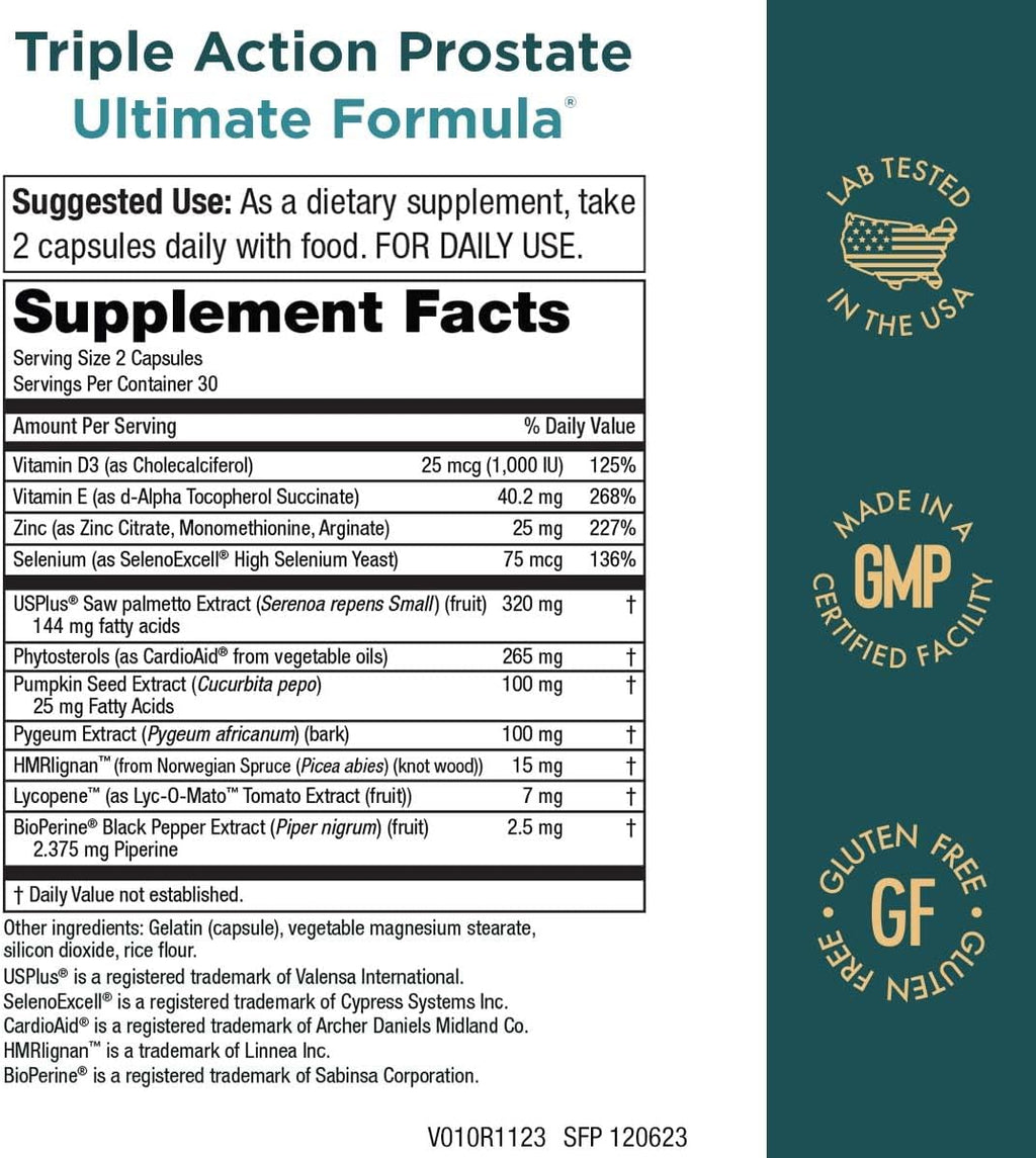As men age, maintaining the health of the prostate gland becomes increasingly vital. Fortunately, there are reliable, science-based nutritional ingredients men can turn to. An increasing body of evidence validates the benefits of 3 key nutrients - Beta-Sitosterol, Lignans and Saw Palmetto in the maintenance of prostatic structure and function.* Triple Action Prostate is an advanced triple action formula that features the clinically proven power of these three evidence based nutrients, plus an entire supporting case of prostate supporting nutrients like 1,000 IU Vitamin D3, Nettle Root and more. Triple Action Prostate provides 320 mg of Saw Palmetto, 15 mg of HMRlignan, 130 mg of Beta-Sitosterol, 7 mg of Lycopene, 2.5mg of Bioperine, and more. In most cases, our supplements are considered stable at full potency for two years from the manufacture date.
