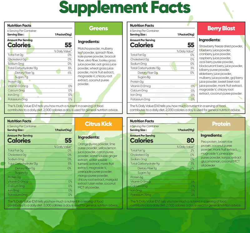 | Flavor | Tasty Greens, Citrus Kick, Berry Blast, Proteina |