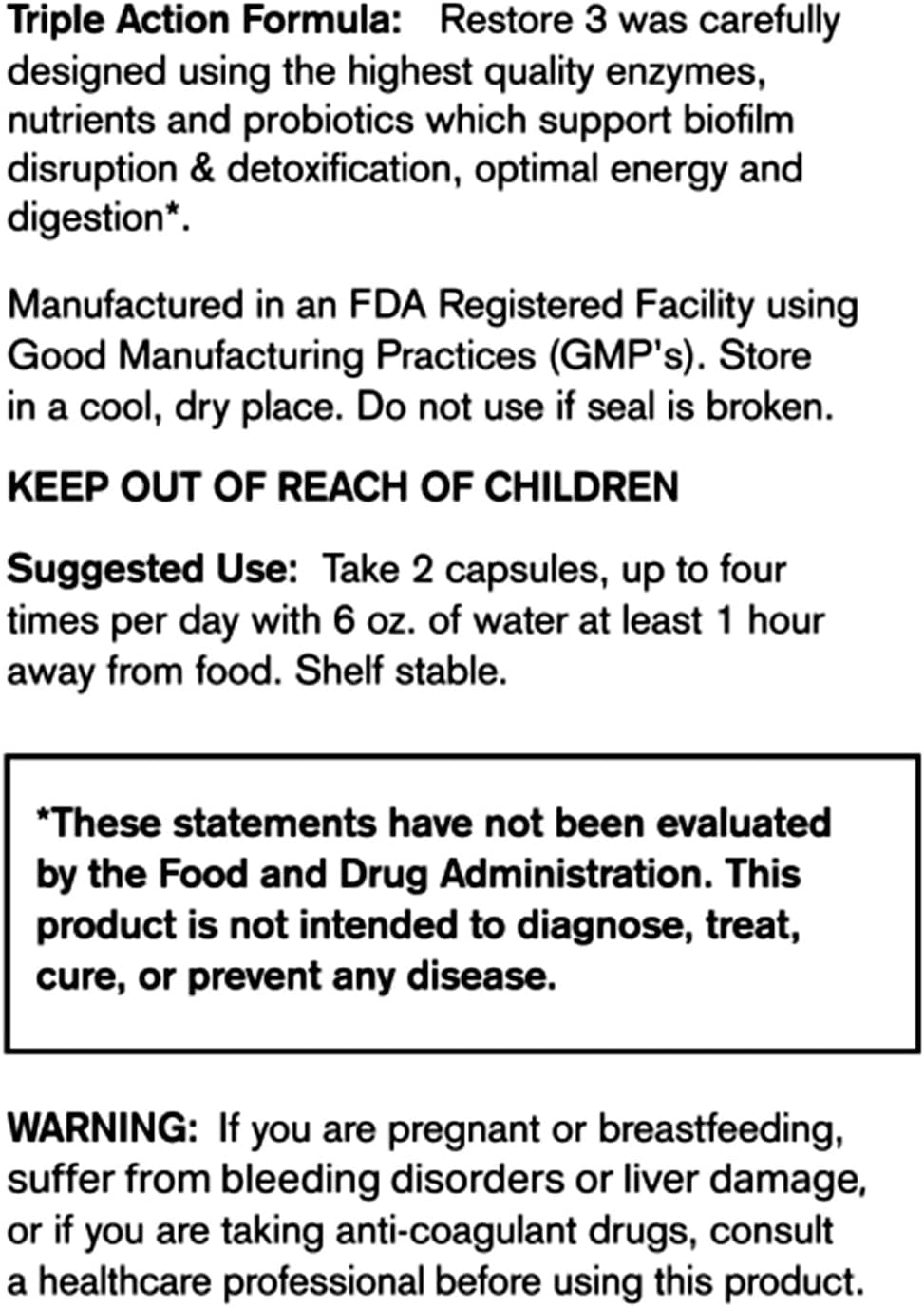 - GOODBYE LETHARGY: Restore 3’s supplement formula is specially designed to rid your gut of biofilms. Biofilms are made up of toxins responsible for body aches, lethargy, digestive upset, sleep, and mood issues. Restore 3 targets and dissolves these toxins from your body.