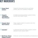 Grape (Vitis vinifera) (Seed) Extract, Organic Astragalus (Radix astragali) (Root) Extract, Organic Beet (Beta vulgaris) (Root) Extract, Pine Bark (Pinus pinaster) (Bark) Extract, AstraGin™ (Astragalus membranaceus & Panax notoginseng) (Root) Extract, Bioperine® Black Pepper (Piper nigrum) (Fruit) Extract, Hypromellose (Veggie Capsule), Silica, and Magnesium Stearate.