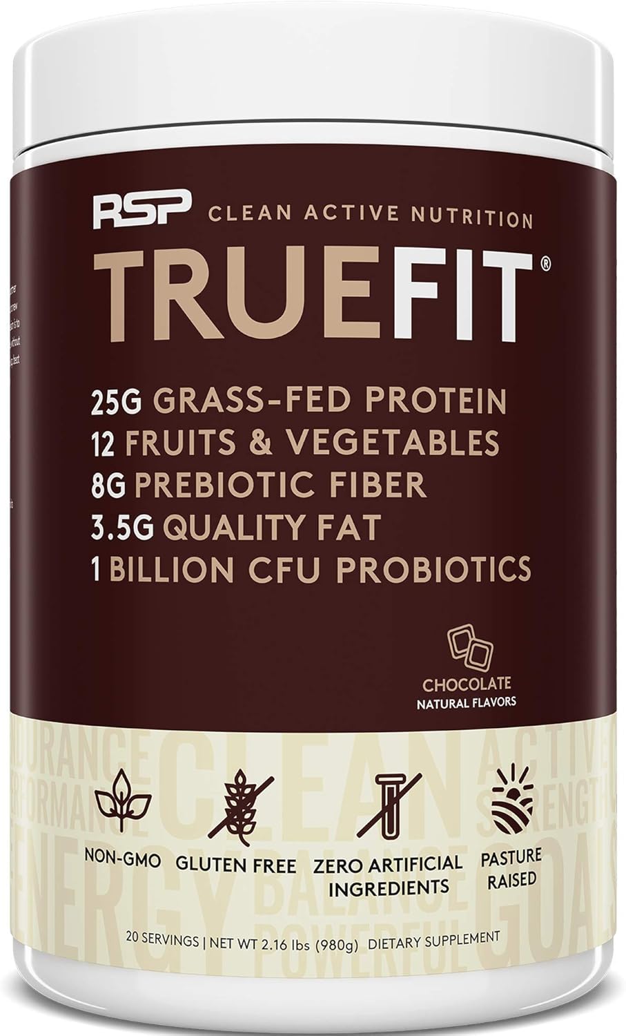 - TRUEFIT PROTEIN POWDER - RSP TrueFit contains 25g of grass-fed whey protein, naturally occurring BCAAs and 1 billion CFU probiotics, making it a complete source for your meal replacement, post-workout, and protein shake needs.
