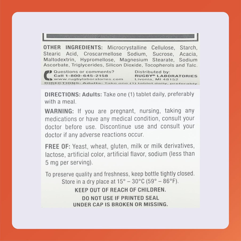 Other Ingredients: Microcrystalline Cellulose, Starch, Stearic Acid, Croscarmellose Sodium, Sucrose, Acacia, Maltodextrin, Hypromellose, Magnesium Stearate, Sodium Ascorbate, Triglycerides, Silicon Dioxide, Tocopherols and Talc.