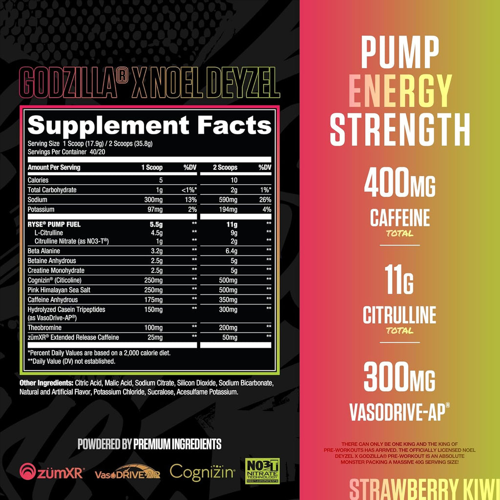 Mix 1-2 scoops of RYSE Godzilla Pre with water (6-8 oz. per scoop) and consume 15-13 minutes prior to exercise. Vary amount of liquid to taste. Use only as directed. CAUTION: DO NOT EXCEED TWO (2) SCOOPS PER DAY.