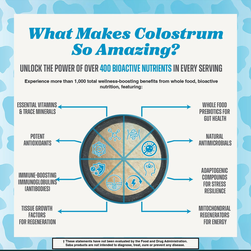 - PREMIUM BOVINE COLOSTRUM WITH 400+ FUNCTIONAL NUTRIENTS + BIOTIN - Saba Pure Colostrum and Biotin Complex is a high-quality superfood supplement enriched with over 400 bioactive nutrients, designed to support immunity, gut health, and overall wellness. Free from artificial additives, it blends smoothly into any beverage without clumping, offering a tasteless, easy-to-mix experience. This unflavored, fast-dissolving formula delivers comprehensive health benefits, including fortified immune support and balanced digestion. Each serving is infused with Biotin to enhance skin radiance and promote fuller, healthier hair. Experience a convenient, potent supplement for whole-body vitality.