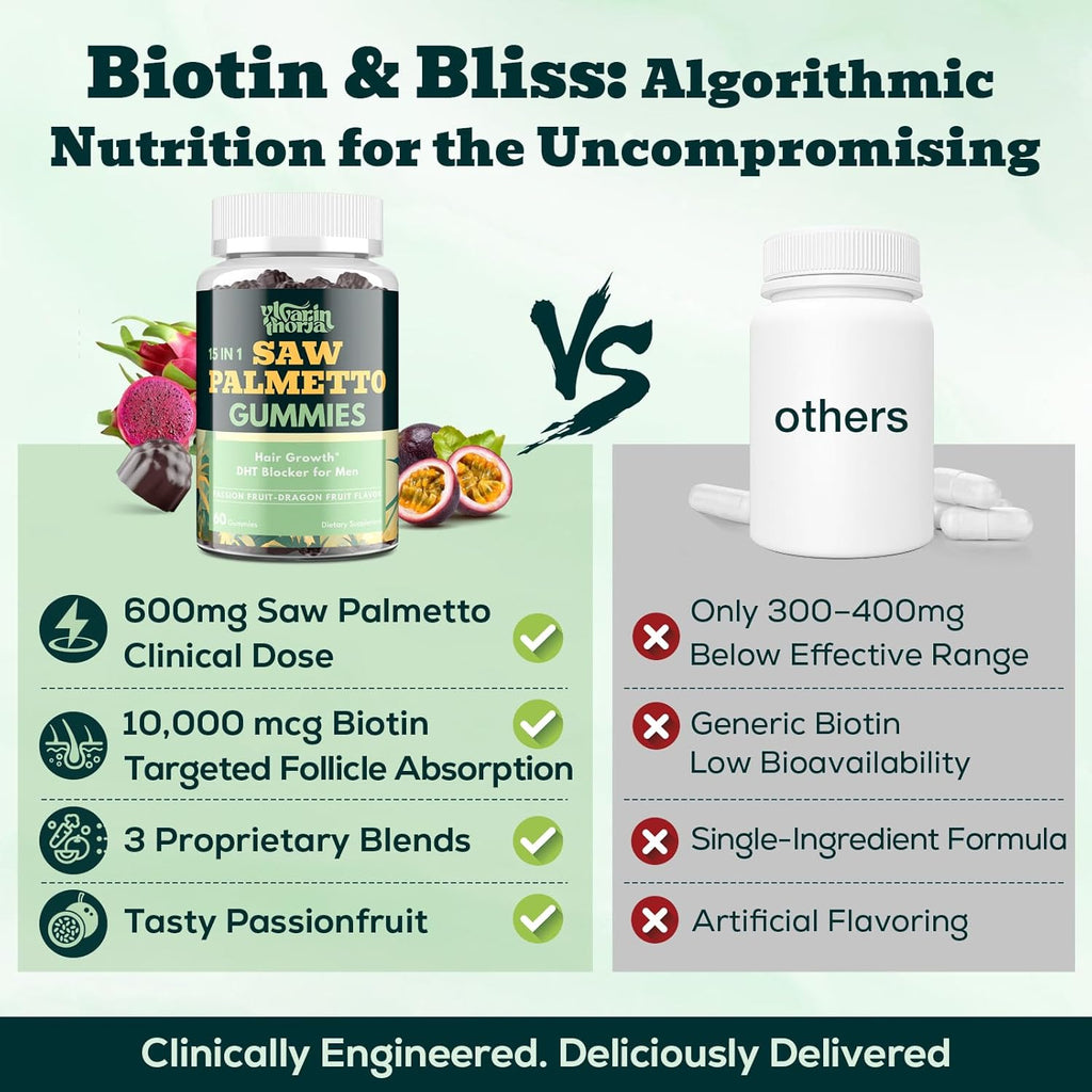 - Reclaim Your Reflection — Fortified DHT Defense in Every Gummy. It’s more than hair—it's about how you see yourself. Each gummy delivers 600mg Saw Palmetto, 10,000mcg Biotin, and a science-backed blend of Green Tea and Quercetin to address what’s standing between you and thicker, fuller strands. Strengthened with Zinc and Vitamin D, this is your daily formula to face the mirror with pride—and confidence you can feel.