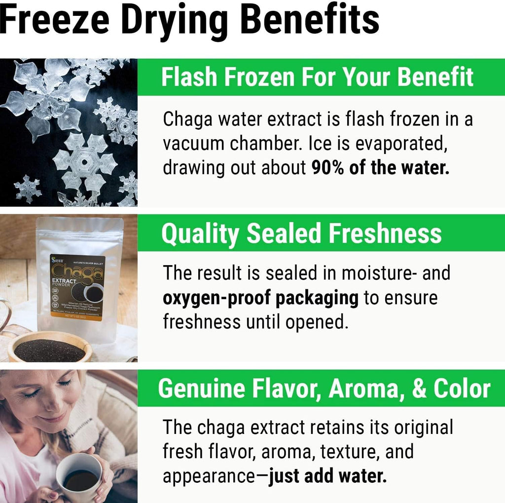 - PREMIUM SIBERIAN CHAGA MUSHROOM - water extract produced by freeze drying process to ensure our product is optimized with the most essential nutrients. Completely soluble in any liquid. High concentration of polysaccharides and beta glucans.