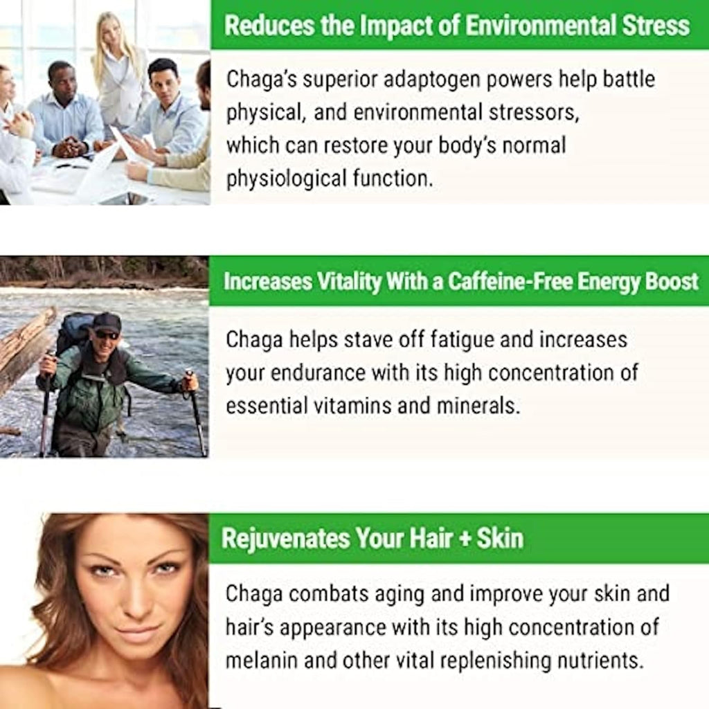 - NATURAL DIETARY SUPPLEMENT - Naturally improve your immune system and overall wellness. Boosts energy and stamina. Ease mild tension and increases concentration. Our Chaga extract is great detoxifier, it effectively clears your body from toxins.