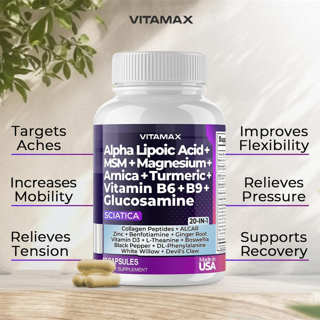 - Packed Relief Driven Vitamins and Minerals : Every serving of Nerve-Plus is a rich source of 20 vital nutrients, including Alpha Lipoic Acid, MSM, Magnesium, Arnica, Turmeric, Vitamin B6, Vitamin B9, and Glucosamine all in one supplement capsules. We prioritize natural ingredients, carefully sourced from sustainable and environmentally conscious farms, guaranteeing that only the finest, market-leading ingredients make it into our product.