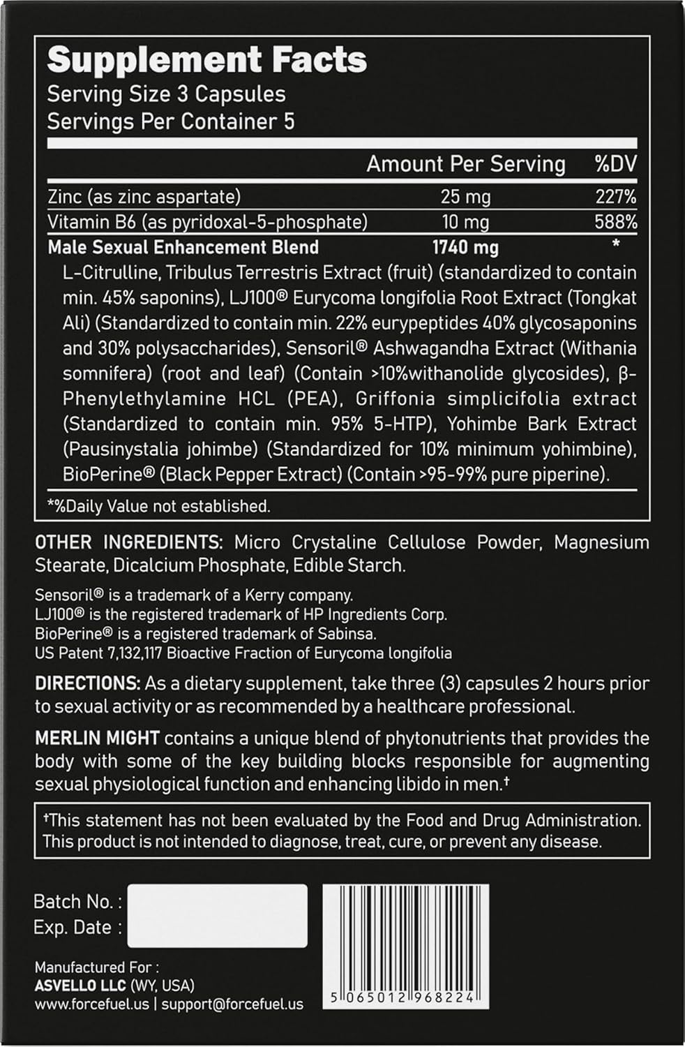 LJ100® Eurycoma longifolia Root Extract (Tongkat Ali) (Standardized to contain min. 22% eurypeptides 40% glycosaponins and 30% polysaccharides) | Sensoril® Ashwagandha Extract (Withania Somnifera) (root and leaf) (Contain >10% withanolide glycosides | Zinc (as zinc aspartate) | Vitamin B6 (as pyridoxal-5-phosphate) | L-Citrulline | Tribulus Terrestris Extract (fruit) (standardized to contain min. 45% saponins) | β-Phenylethylamine HCL (PEA) | Griffonia simplicifolia extract (Standardized to contain min. 95% 5-HTP) | Yohimbe Bark Extract (Pausinystalia johimbe) (Standardized for 10% minimum yohimbine) | BioPerine® (Black Pepper Extract) (Contain >95-99% pure piperine)