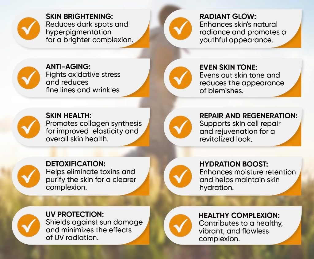 - Product Benefits: Skin Brightening, Skin Whitening, Anti-Aging, Dark Spot Removal, Detoxification, Radiant Glow, Even Skin Tone, Hydration Boost, Skin Repair and Rejuvenation, Healthy Complexion See more