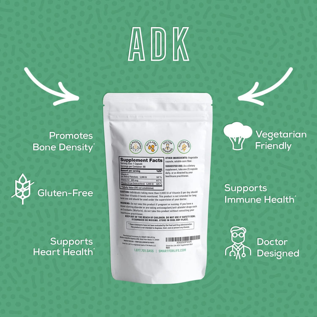 - Smart for Life ADK Vitamin supplement offers a powerful blend of Vitamin A, D3, and K2 in a 90-day supply. Each vegan and gluten-free capsule is designed for easy swallowing. The recommended daily dose is one pill per adult, preferably with food, or as directed by a healthcare practitioner. This formula supports overall bone health, cardiovascular health, immunity, and calcium absorption.
