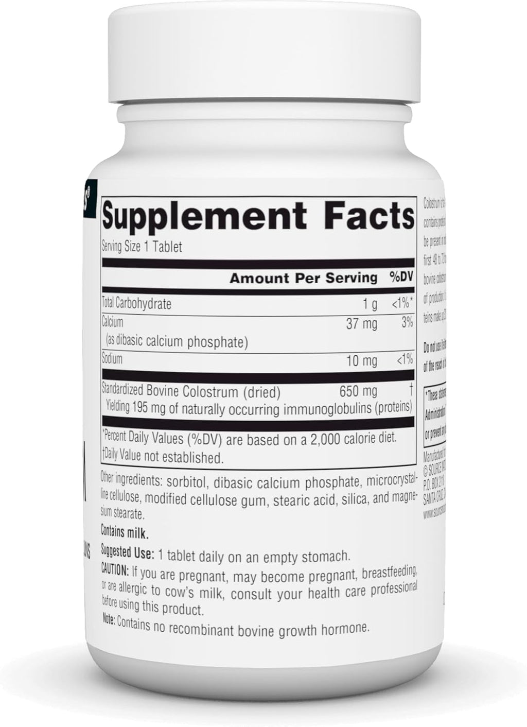 Colostrum is the first “milk” given to a newborn calf by its mother, and contains proteins including immunoglobulins, or antibodies, that may not be present in ordinary milk. Colostrum is normally secreted only in the first 48 to 72 hours after birth. Source Naturals Colostrum is true bovine colostrum (not cheese whey), collected within the first 12 hours of production. It is then standardized, so that the immunoglobulin proteins make up 30% of the finished product. Note: Contains no recombinant bovine growth hormone. Please contact our in-house customer support if you have any questions.