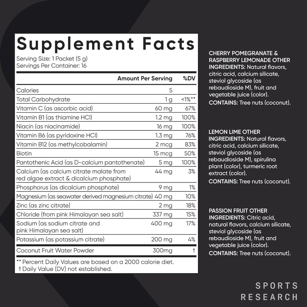 Electrolytes. Natural flavors. citric acid. calcium silicate. steviol glycoside (as rebaudioside M). fruit and vegetable juice (color). CONTAINS: Tree nuts (coconut).