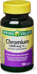 Spring Valley Chromium Dietary Supplement, 1,000 mcg, is a supplement that provides metabolism support.* Chromium is an essential mineral that may support the healthy metabolism of carbohydrates, proteins, and fats.* *These statements have not been evaluated by the Food and Drug Administration. This product is not intended to diagnose, treat, cure, or prevent any disease. Each tablet contains 1000 micrograms of chromium. The suggested adult dosage is one tablet daily, preferably with a meal. These tablets contain no gluten, soy, peanuts, or dairy and are free of artificial colors, flavors, sweeteners, and preservatives.