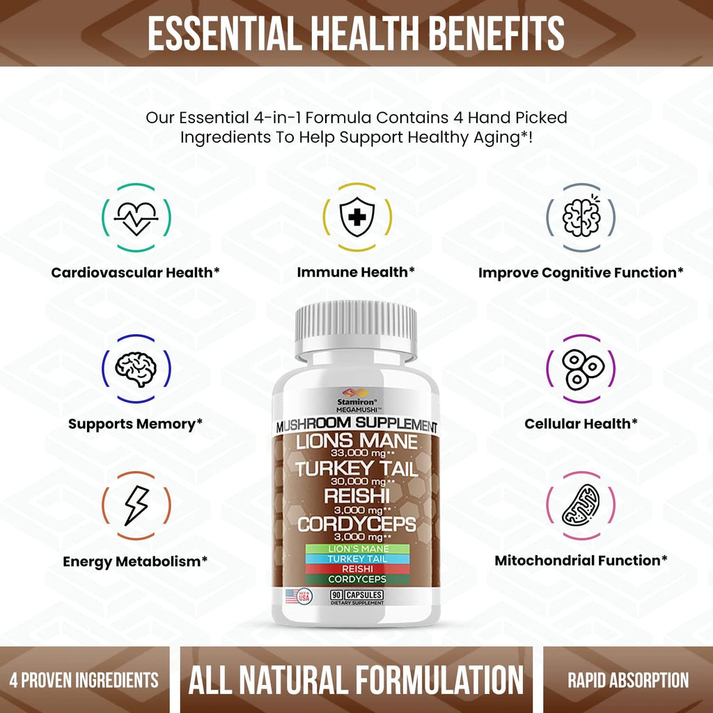 - Introducing MegaMushi Lion's Mane Supplement - the ultimate mushroom supplement that combines the power of Lion's Mane, Turkey Tail, Cordyceps, and Reishi mushrooms. Our potent chaga reishi mushroom formula is designed to boost your immunity, focus, and energy levels. Each bottle contains 90 capsules of premium quality cordyceps chaga mushrooms, ensuring you get the most benefits from each dose.