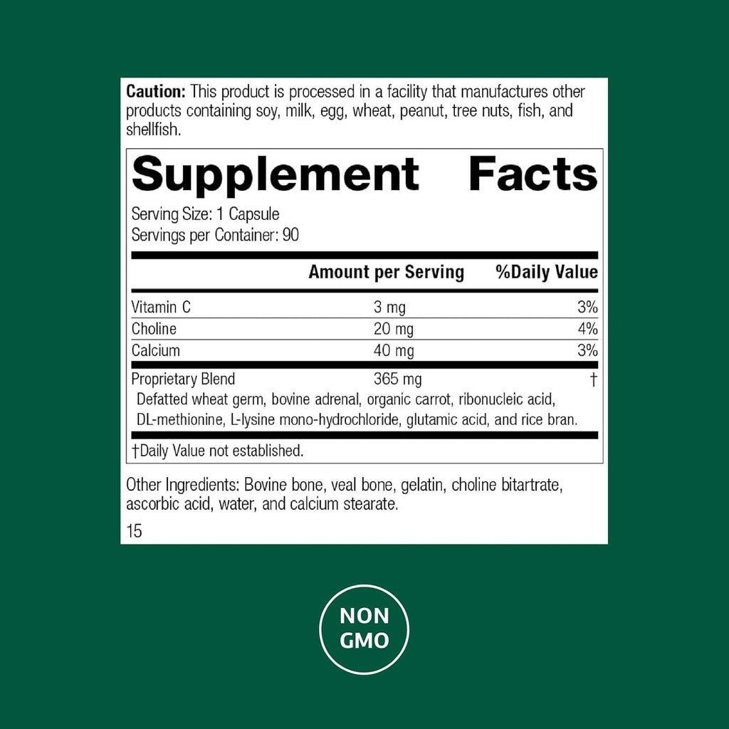 Each Serving Size (1 Capsule) contains: Vitamin C 3 mg, Choline 20 mg, Calcium 40 mg. Proprietary Blend 365 mg: Defatted wheat germ, bovine adrenal, organic carrot, ribonucleic acid, DL-methionine, L-lysinemono-hydrochloride, glutamic acid, and rice bran. Other Ingredients: Bovine bone, veal bone, gelatin, choline bitartrate, ascorbic acid, water, and calcium stearate.