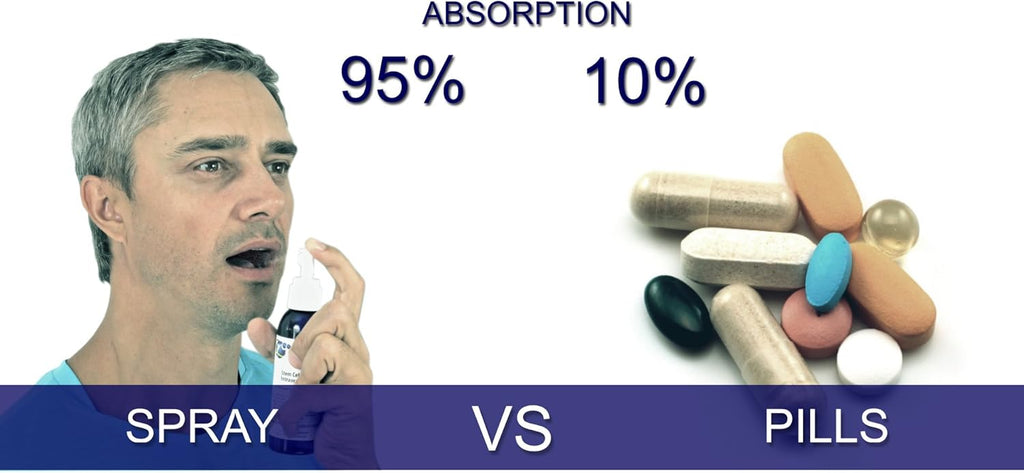 - Intra-oral application (sprayed under the tongue) provides a 95% absorption rate of nutrients. Pills and capsules provide only a 10% to 20% absorption rate of nutrients.
