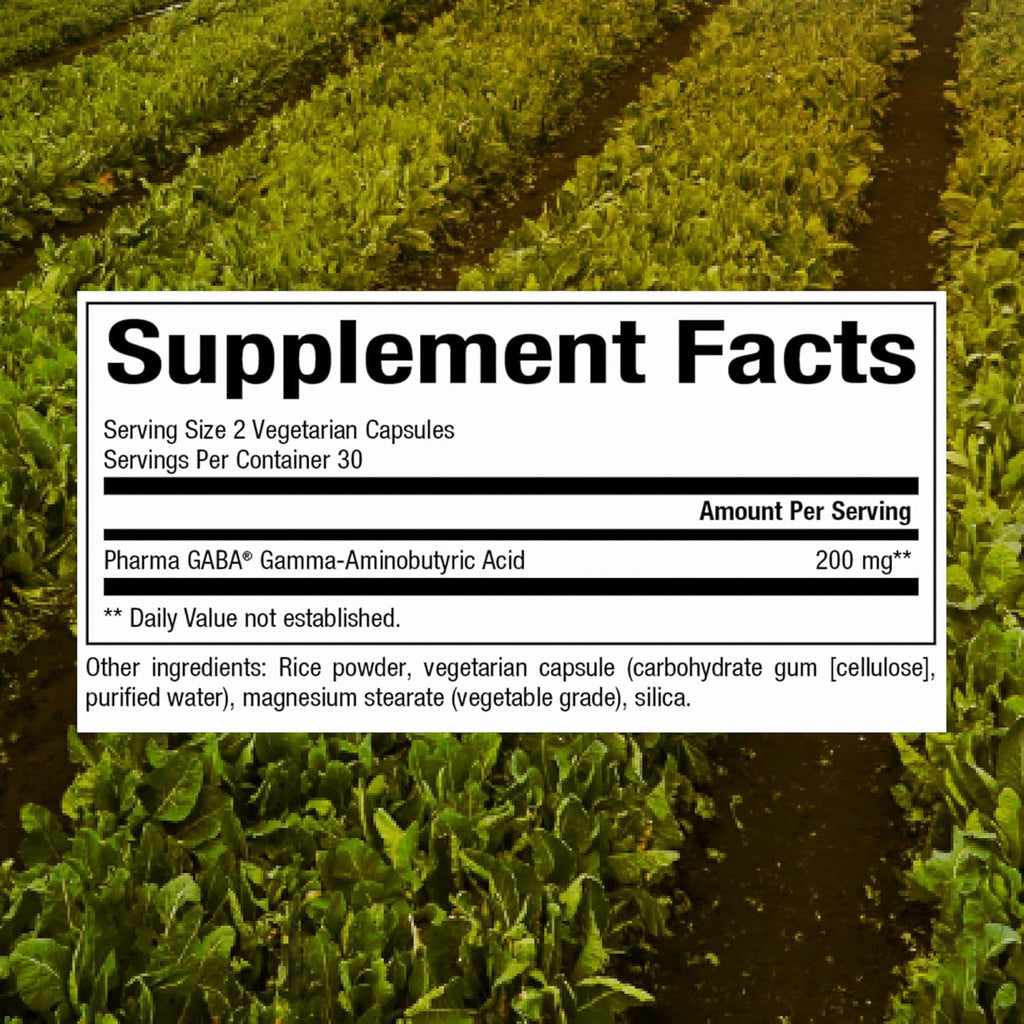 Pharma GABA Gamma-Aminobutyric Acid 200mg, rice powder, vegetarian capsule (carbohydrate gum, cellulose, purified water), magnesium stearate (vegetable grade), silica.