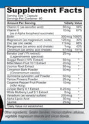 Vitamin C, Vitamin E, Biotin, Magnesium, Zinc, Manganese, Chromium, Banaba Leaf, Guggul, Bitter Melon, Licorice Root Extract, Cinnamon Bark Powder, Gymnema Sylvestre Leaf Powder, Yarrow Flowers Powder, Cayenne Pepper Powder, Juniper Berry Powder, White Mulberry Leaf Powder, Vanadium, Alpha Lipoic Acid, L-Taurine
