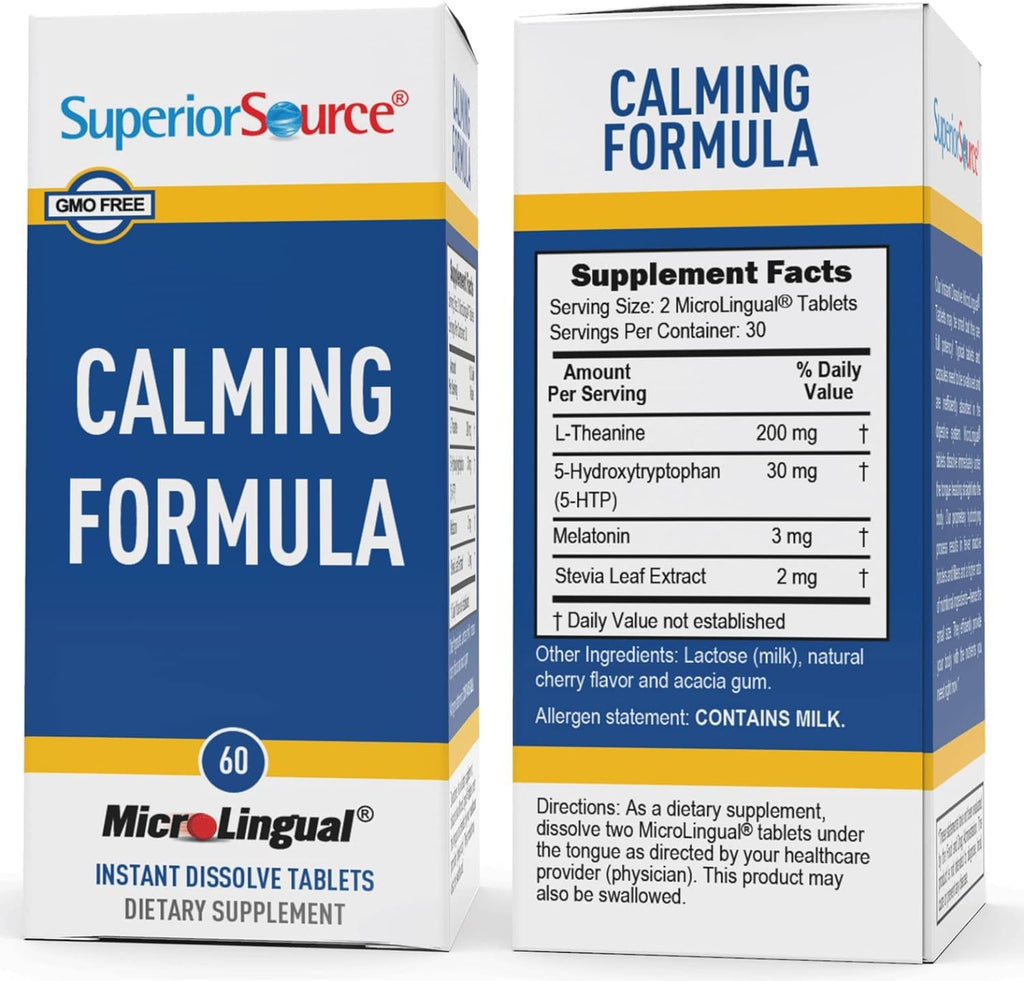 Superior Source Calming Formula, L-Theanine, Melatonin, Under The Tongue Quick Dissolve MicroLingual Tablets, 60 Ct, 5-HTP for Enhanced Serotonin Conversion, Sleep Support, Non-GMO