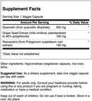Quercetin (from quercetin dihydrate) 250 mg *,Grape Seed Extract (Vitis vinifera) 100 mg *,Resveratrol 100 mg *,Other ingredients: Hypromellose (vegetable capsule), silica