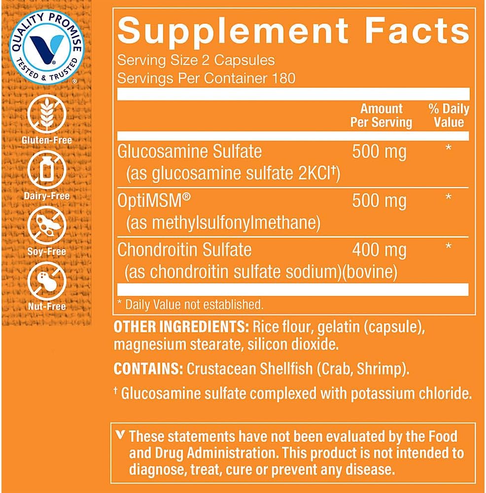 - 500mg Glucosamine Sulfate, 400mg Chondroitin Sulfate, 500mg MSM
