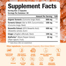 Organic Turmeric (Curcuma longa, Root) 800 mg, Turmeric Extract (95% Curcuminoids) (Curcuma longa, Root) 100 mg, Boswellia Extract (Boswellia serrata, Gum) 600 mg, Ginger (Zingiber officinale, Root) 100 mg, BioPerine (Piper nigrum, Fruit) 10 mg. Other ingredients: Hypromellose Capsule, Rice Extract Blend.