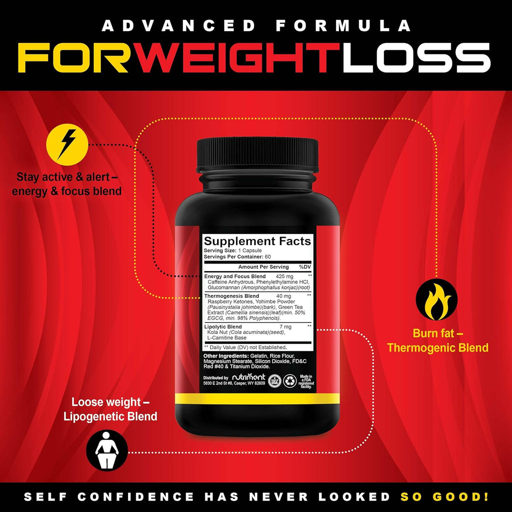 Energy and Focus Blend - 425 mg Caffeine Anhydrous, Phenylethylamine HCI, Glucomannan (Amorphophallus konjac) (root). Thermogenesis Blend 40 mg Raspberry Ketones, Yohimbe bark (Pausinystalia johimbe), Green Tea Extract (Camellia sinensis) (leaf) (min. 50% EGCG, min. 98% Polyphenols). Lipogenic Blend 7 mg Kola Nut (Cola Acuminata) (seed), L-Carnitine Base Other Ingredients: Gelatin, Rice Flour, Magnesium Stearate, Silicone Dioxide, FD&C Red #40 & Titanium Dioxide.